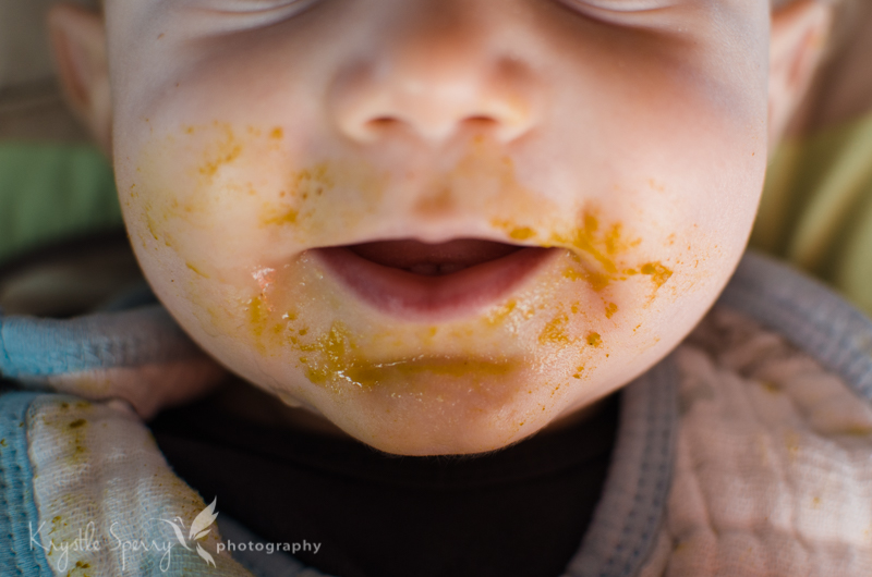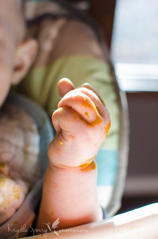 While my daughter took to solid foods immediately, my son has decided that food is only for playing. Not eating. Momma’s milk is the only thing worth eating (flattered, but would like him to eat food…). I still try to feed him, three times a day. Typically he’ll eat/tolerate the sweets/fruits, but pretty much wants nothing to do with veggies. And texture…well, that just leads to gagging. He’s over 8 months old, so I was hoping to have him eating a bit more, but in the mean time, we just play with our “pumpkin spinach” lunch puree (not sure I blame him on that one:). Someday I know I’ll miss these messy hands and faces.