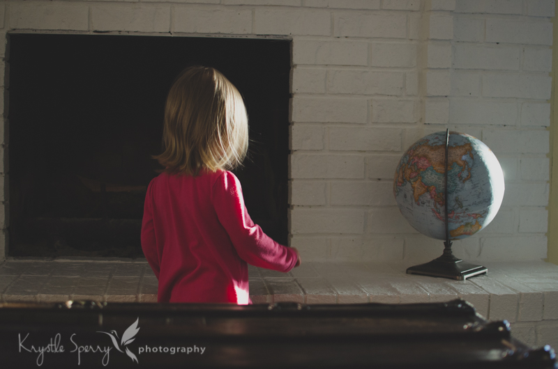 Tuesday: B loves her Lincoln Logs! Buuuut, she doesn’t exactly build log cabins yet. She really just takes out the long pieces and uses them as drumsticks…Today, she was drumming on the fireplace, then on the globe (I’m sure there is some irony in there somewhere). Don’t worry, the globe was left here in the house by the previous owner and looks like someone punched it at one point, so it’s already broken:P