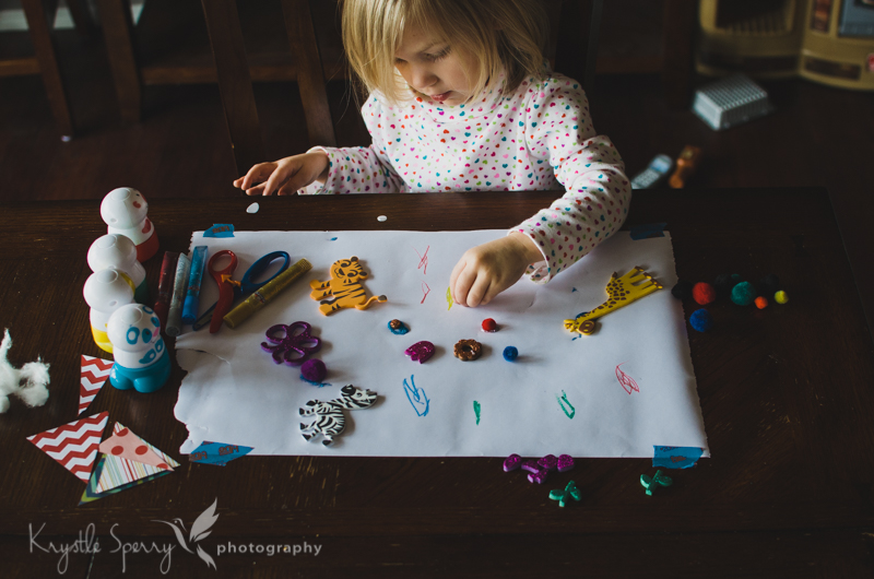 Tuesday: “Making a beautiful picture!” Everyday during Peanut’s morning nap, she wants to make a beautiful picture. So she does:) Glitter glue and stickers are her favorites right now ❤
