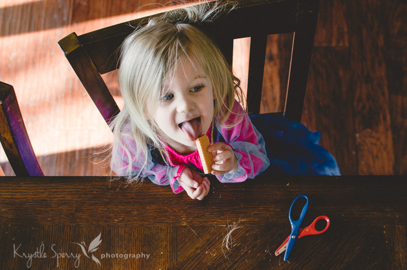 This one is from yesterday….after she cut her own hair. She was sitting at the table, playing with glue, scissors, etc. for a little craft time. I picked everything up for lunch….except the scissors apparently. Oops. So, she got a haircut yesterday:)
